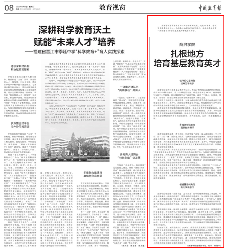 6月3日,《中國教育報》“教育視窗”欄目刊發(fā)了校長權(quán)雅寧署名文章《商洛學院扎根地方培育基層教育英才》,對我校扎根秦嶺培育教育人才的經(jīng)驗成果進行了專題報道。