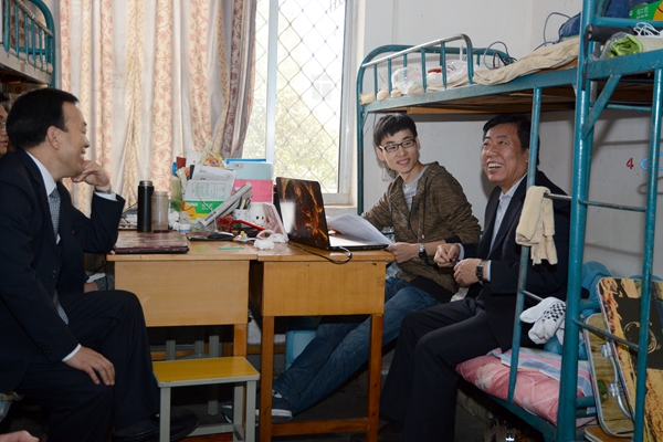 在彭虎軍和學校辦公室、保衛(wèi)處、后勤保障處相關負責人的陪同下,張玉明深入我校食堂、公寓和監(jiān)控中心視察。每到一處,張玉明都詳細了解相關安全制度及落實情況,仔細檢查安全設施的維護保養(yǎng)狀況,并和學生進行了現(xiàn)場交流,傾聽他們的意見和建議。在學生食堂,張玉明仔細檢查了操作間的衛(wèi)生條件、飯菜樣本,詢問了解飯菜品種、價格情況,嚴格要求食堂工作人員把好食品安全關。在學生公寓,張玉明認真檢查了公寓管理日志,詳細了解公寓安全管理各項制度的執(zhí)行落實情況,并在宿舍里向學生詢問了對學校各項工作的意見。