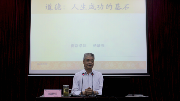 本期道德講堂由唱道德歌曲、誦道德經(jīng)典、學(xué)道德模范、聽道德報告四個環(huán)節(jié)組成?;顒釉谟茡P(yáng)的《公民道德歌》中拉開帷幕,隨后,在健康管理學(xué)院教師李夢姣的帶領(lǐng)下,社會1801班全體學(xué)生誦讀了《弟子規(guī)·信》中的片段,深情詮釋了道德經(jīng)典的魅力,贏得了陣陣掌聲。接著,現(xiàn)場人員共同觀看了陜西省第五屆道德模范、孝老愛親類“中國好人”唐偉麗的感人事跡短片。活動還邀請我校圖書館館長楊增強(qiáng)教授以“道德:人生成功的基石”為題作了專題報告,報告指出,當(dāng)代大學(xué)生應(yīng)牢固樹立社會主義核心價值觀,堅持誠實(shí)守信的人生信條,把誠信融入到學(xué)習(xí)生活的方方面面。