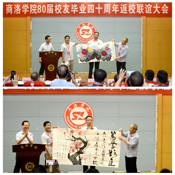 商洛學(xué)院80屆校友總聯(lián)絡(luò)人孟軍,在聯(lián)誼大會上代表全體校友感謝學(xué)校對此次活動的重視和支持,并現(xiàn)場贈送《桃李清風(fēng)報春曉·江湖夜雨思母?!贰赌档D》等書畫作品表達(dá)對母校的深情厚意。他在發(fā)言中表示,憶往昔,歲月崢嶸,母校承載了一代人的青春時光,不管如今身在何方,故土的鄉(xiāng)情、母校的恩情、師生的友情都絕不能忘;看今朝,倍加珍惜,80屆校友們親身經(jīng)歷了祖國改革開放40年的發(fā)展變化、親眼目睹了母校翻天覆地的發(fā)展壯大,這些來之不易的成果需要我們共同呵護珍惜;講未來,豪情滿懷,如今的祖國屹立于世界之林,揚起了大國的風(fēng)帆,如今的商洛學(xué)院作為陜西省“一流學(xué)院”建設(shè)單位,已成長為一棵枝繁葉茂的大樹,站在新時代的節(jié)點展望未來的發(fā)展,我們信心滿滿。衷心祝愿祖國的明天更美好、母校的未來錦繡如花。