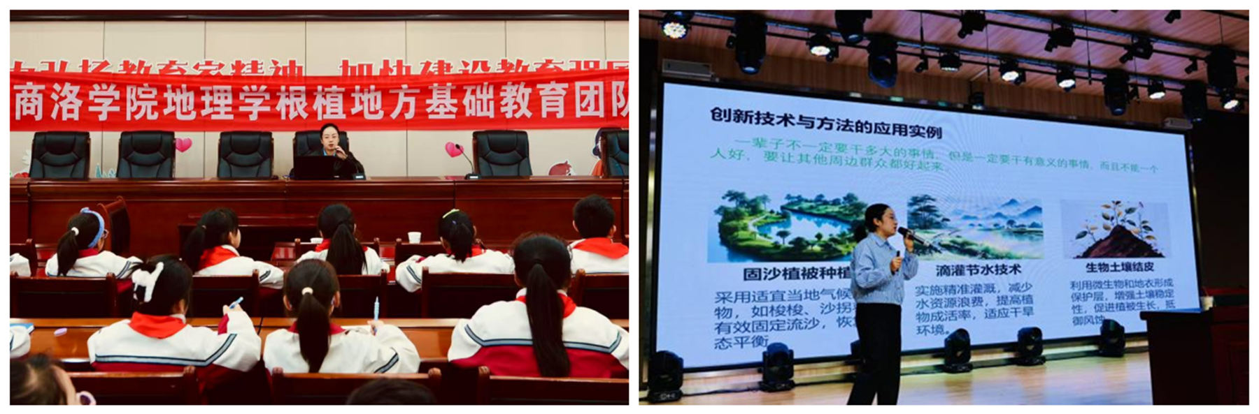 3月26日,地理科學(xué)博士房舒領(lǐng)銜的科研團(tuán)隊(duì)赴商洛市小學(xué)和商州區(qū)第六小學(xué),以“瀚海春風(fēng)——石光銀的綠色希望之旅”為題,為兩校師生帶來(lái)一堂別開(kāi)生面的生態(tài)文明實(shí)踐課。團(tuán)隊(duì)通過(guò)豐富的圖片資料和生動(dòng)的講解,向?qū)W生們展示了石光銀帶領(lǐng)村民治沙的艱辛歷程與感人事跡。同時(shí),團(tuán)隊(duì)向參會(huì)師生介紹了本團(tuán)隊(duì)成員的科研成果及應(yīng)用案例,激勵(lì)廣大師生投身環(huán)保事業(yè),共同守護(hù)地球家園。