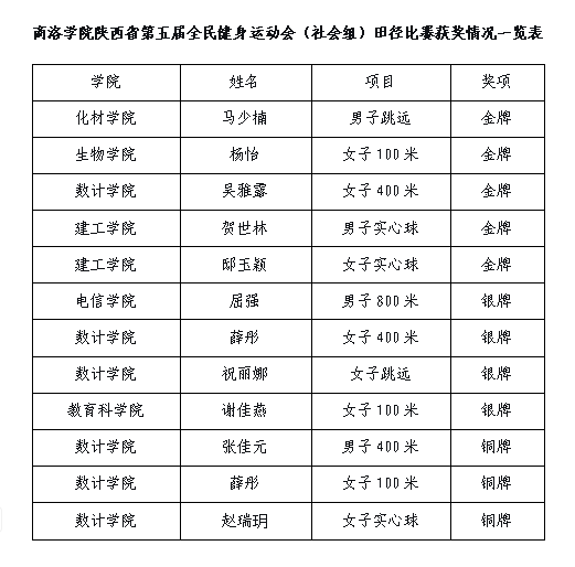 9月14日,陜西省第五屆全民健身運(yùn)動(dòng)會(huì)(社會(huì)組)田徑比賽在山陽縣落幕,在巔峰組比賽中,我校教師桑國鵬獲男子實(shí)心球第一名、王品獲男子跳遠(yuǎn)第二名、閆蘇榮獲女子100米第二名,牛洋洋獲女子實(shí)心球第二名。比賽由體育教學(xué)研究部主任黃顯忠擔(dān)任領(lǐng)隊(duì),王健、王品、桑國鵬擔(dān)任教練,帶領(lǐng)我校學(xué)生取得5項(xiàng)金獎(jiǎng)、4項(xiàng)銀獎(jiǎng)、3項(xiàng)銅獎(jiǎng)的好成績,充分展現(xiàn)了學(xué)校體育育人的成果和學(xué)子們良好的精神風(fēng)貌。
