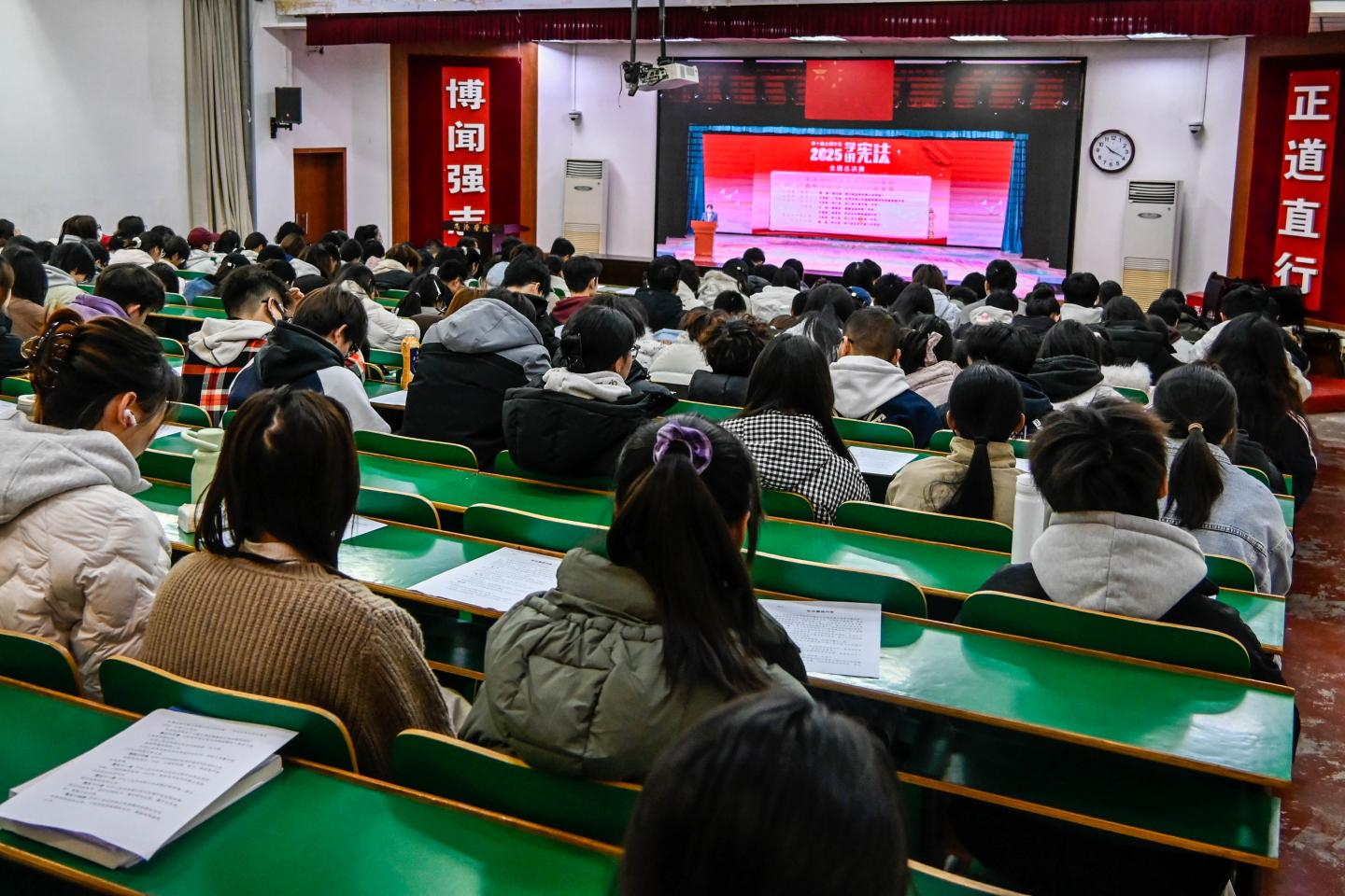 上午10點(diǎn),活動(dòng)在莊嚴(yán)的國(guó)歌聲中拉開(kāi)序幕。教育部領(lǐng)導(dǎo)在主會(huì)場(chǎng)領(lǐng)讀憲法部分條款,我校師生在北新街校區(qū)和丹江校區(qū)同步跟讀,跟唱歌曲《憲法伴我們成長(zhǎng)》,觀摩第十屆全國(guó)學(xué)生“學(xué)憲法講憲法”活動(dòng)全國(guó)總決賽演講比賽優(yōu)秀選手展演,共同學(xué)習(xí)憲法知識(shí),感受憲法力量,明確憲法威嚴(yán)。