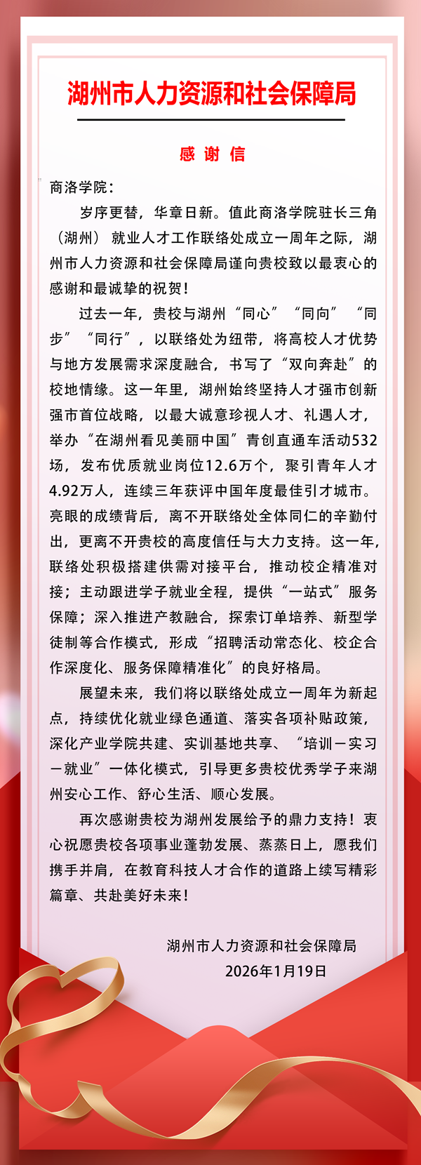 近日,湖州市人力資源和社會(huì)保障局向商洛學(xué)院發(fā)來(lái)感謝信,對(duì)學(xué)校以駐長(zhǎng)三角(湖州)就業(yè)人才工作聯(lián)絡(luò)處為紐帶,將高校人才優(yōu)勢(shì)與地方發(fā)展需求深度融合的工作實(shí)踐表示感謝,表達(dá)了與學(xué)校攜手并肩共同譜寫(xiě)教育、科技、人才“三位一體”發(fā)展新篇章的良好愿景。