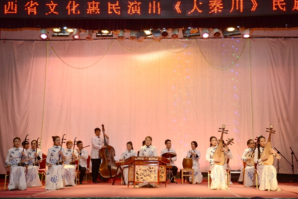 本次音樂會分民族器樂和聲樂表演兩大部分,既有充滿民族風(fēng)情的秦腔、民歌演唱,又有板胡、二胡、嗩吶、笛子等民族特色樂器演奏。音樂會以一曲高昂、豪邁的二胡齊奏《戰(zhàn)馬奔騰》開場,《西部放歌》《秦腔牌子曲》《秦川抒懷》、《大秦川》《花好月圓》等曲目次第登場。其旋律時而柔和,時而歡快,時而磅礴,時而激昂。歌唱家們以其深厚的唱功,高亢的音調(diào)、優(yōu)美的音色,豐富的感情將歌曲中的豪放粗獷、激情澎湃、蕩氣回腸等特色表現(xiàn)得淋漓盡。演奏家們高超的技藝,將二胡、琵琶、嗩吶等民族樂器發(fā)揮到極致,帶領(lǐng)觀眾們領(lǐng)略中華傳統(tǒng)民族音樂的風(fēng)情。在一首壯懷激烈的民族管弦樂《好漢歌》中,音樂會圓滿落下帷幕。