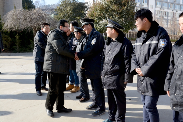 在黨政辦公室、保衛(wèi)處、后勤保障處負責人的陪同下,魏書堂、彭虎軍一行先后前往北新街校區(qū)、丹江校區(qū)各處門衛(wèi)、教學(xué)樓、公寓、圖書館、體育場值班室,后勤保障處公寓服務(wù)中心、水電班,保衛(wèi)處警務(wù)室、監(jiān)控室等一線崗位,與工作人員親切握手,代表學(xué)校黨政向大家拜年,對除夕之夜仍堅守在工作崗位上的同志表示感謝,并親手送上節(jié)日慰問品。在每一個慰問地點,校領(lǐng)導(dǎo)都詳細詢問了各部門的工作情況,要求每位工作人員在春節(jié)期間一定要把安全穩(wěn)定放在首位,保證全校師生度過一個溫暖、祥和的春節(jié)。