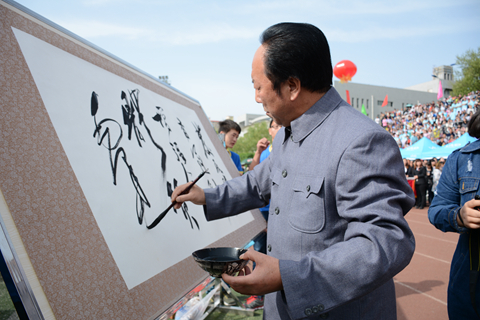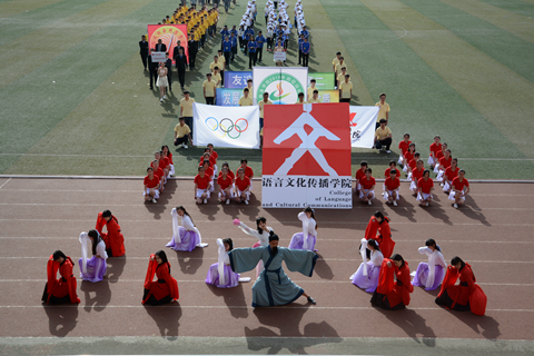 本次開幕式亮點(diǎn)頗多,異彩紛呈。文傳院代表隊(duì)的漢服舞《莊周夢(mèng)蝶》以“力”與“柔”的完美結(jié)合為充滿激情的運(yùn)動(dòng)場(chǎng)增添了柔美的色彩?;膶W(xué)院利用26個(gè)字母和化學(xué)反應(yīng)變色打出了“化材學(xué)院”四字,令人眼前一亮。建工院方陣變換了數(shù)字40與10并配以寫有“乘風(fēng)破浪四十載,追夢(mèng)逐鹿十年興”字樣的橫幅慶祝我校建校40周年、升本10周年。教職工方陣以歌伴舞《好日子》、民族樂器表演、書法表演等展示了書法協(xié)會(huì)、籃球協(xié)會(huì)、足球協(xié)會(huì)的風(fēng)采。在大型文體表演節(jié)目當(dāng)中,我校學(xué)子以隊(duì)列表演、啦啦操排出了“四十”“1976-2016”等字樣,慶祝建校40周年。匕首操、軍體拳、水鼓舞等節(jié)目展示了我校學(xué)子的青春活力和永不言敗的精神。航模協(xié)會(huì)也進(jìn)行了精彩的飛行表演。
