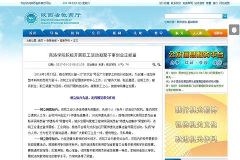 1月13日,陜西省教育廳官網(wǎng)以《商洛學(xué)院積極開展職工活動凝聚干事創(chuàng)業(yè)正能量》為題,對我校工會2016年工作成果進行了全面報道。文章指出,2016年,我校三屆一次“雙代會”號召廣大教職工積極行動起來,為創(chuàng)建一流應(yīng)用型本科院校而努力奮斗。校工會緊密圍繞學(xué)校中心工作,以“服務(wù)大局、貼近基層、創(chuàng)新工作、服務(wù)到位、職工滿意”為目標(biāo),圍繞“樹立標(biāo)兵先進,發(fā)揮模范帶頭作用;豐富職工生活,凝聚發(fā)展正能量;關(guān)心關(guān)愛職工,凝聚發(fā)展人心”等方面,積極開展特色活動,收獲了成功與喜悅,凝聚了人心,增強了教職工的歸屬感和認(rèn)同感,匯集了學(xué)校發(fā)展正能量。