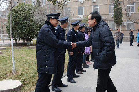 在黨政辦公室、保衛(wèi)處、后勤保障處負(fù)責(zé)人的陪同下,魏書堂、彭虎軍一行先后前往北新街校區(qū)、丹江校區(qū)各處門衛(wèi)、教學(xué)樓、公寓、圖書館、體育場值班室,后勤保障處公寓服務(wù)中心、水電班,保衛(wèi)處警務(wù)室、監(jiān)控室等一線崗位,與工作人員親切握手,代表學(xué)校黨政向大家拜年,對除夕之日仍堅守在工作崗位上的同志表示感謝,并親手送上節(jié)日慰問品。在每一個慰問地點,校領(lǐng)導(dǎo)都詳細(xì)詢問了各部門的工作情況,對值班人員噓寒問暖,叮囑他們要安排好工作與家庭事務(wù),并要求每位工作人員在值班期間一定要把安全穩(wěn)定放在首位,保證全校師生度過一個溫暖、祥和的春節(jié)。