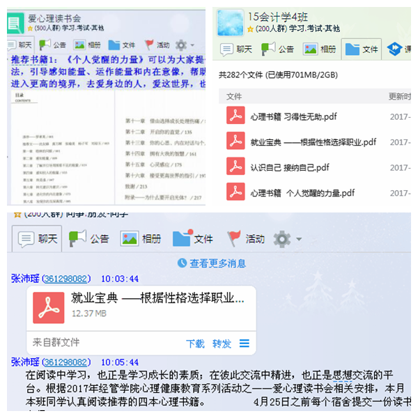 此次讀書活動以網(wǎng)絡(luò)(QQ、微信群)為平臺組建“愛心理讀書會”,心理輔導(dǎo)員定期推薦閱讀與大學(xué)生生活密切相關(guān)的心理書籍,將PDF電子版本的《個人覺醒的力量》、《習(xí)得性無助》、《認(rèn)識自己,接納自己》和《就業(yè)寶典:根據(jù)性格選擇職業(yè)》等心理書籍傳至群共享,各班心理委員組織學(xué)生在固定時間進行線下集體閱讀,每個周三下午與心理輔導(dǎo)員進行線上溝通、答疑解惑,4月底各班提交讀書心得并開展全院讀書評比活動,達到吸引讀書、方便讀書的活動目的。
