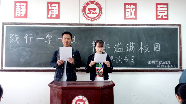 本次活動主要由經(jīng)典詩文朗誦、經(jīng)典著作讀書分享、習(xí)近平總書記系列重要講話研讀以及簽名活動四部分組成,一方面號召廣大師生多讀書、讀好書、會讀書,另一方面引導(dǎo)廣大青年團員認(rèn)真研讀習(xí)近平總書記關(guān)于治國理政治的專著和系列重要講話,認(rèn)真領(lǐng)會習(xí)近平總書記的治國理政新理念新思想新戰(zhàn)略,堅定理想信念,踐行“一學(xué)一做”,做合格共青團員。