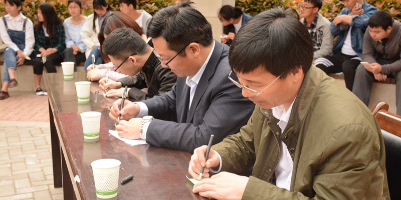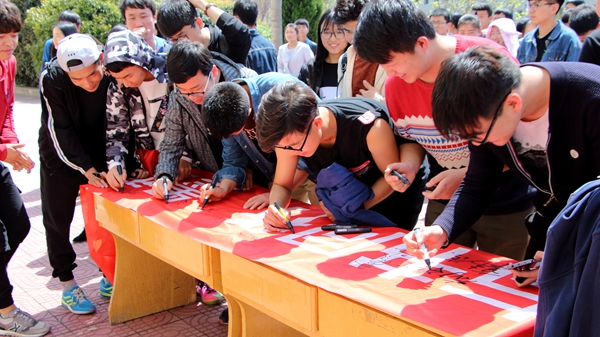 4月14日,數(shù)計學(xué)院團總支在二號教學(xué)樓前舉辦“與書同行,墨香存華”活動簽字儀式,2016級全體同學(xué)參加本次活動。