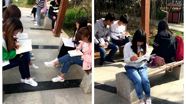 早上8點,同學(xué)們帶著自己喜歡的書籍來到竹園,沐浴著陽光大聲地朗讀,校園里充滿了濃濃的書香。有的同學(xué)將自己喜歡的書籍推薦給同學(xué),進行知識的傳遞;有的同學(xué)將自己喜歡的文章繪聲繪色讀給同學(xué),贏得了在場師生的陣陣掌聲。