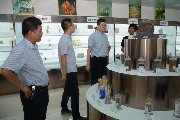 史高領一行深入重點實驗室沙盤標本陳列室、有價元素提取室、材料制備室、材料性能檢測室、尾礦無害化處理室等處,詳細考察了實驗室硬件設施建設、配備情況和項目研究工作開展進度。我?;膶W院院長、尾礦資源綜合利用重點實驗室主任周春生做了詳細講解。