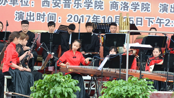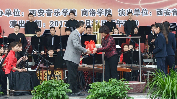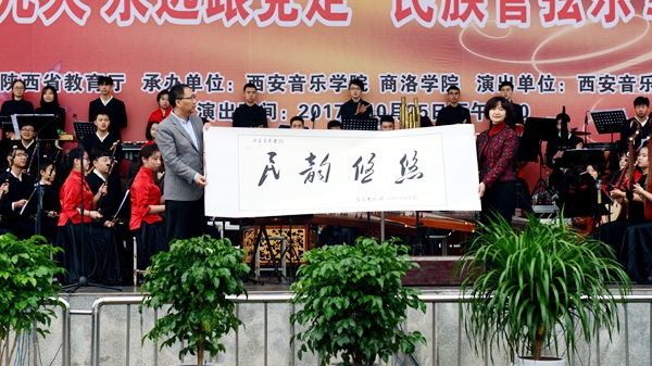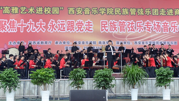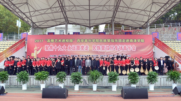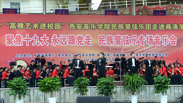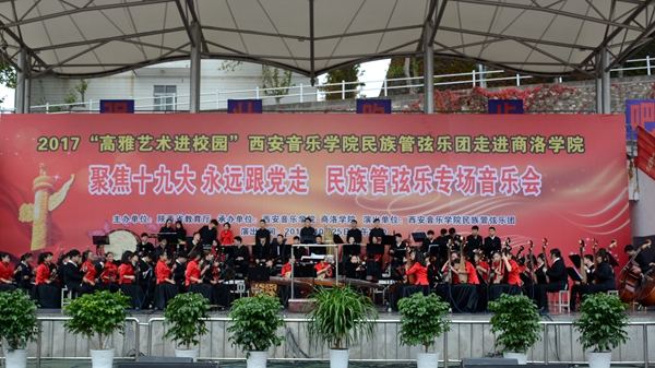 10月25日,由陜西省教育廳主辦的陜西省2017年“高雅藝術進校園”系列活動——西安音樂學院民族管弦樂專場音樂會在我校舉辦,音樂會以“聚焦十九大 永遠跟黨走”為主題。來自西安音樂學院的85名演員為我校師生奉獻了一場精彩的視聽盛宴。西安音樂學院紀委書記劉曉霞、副書記全勇,校領導龍治剛、王思懷、魏書堂、劉寶盈、劉勇,來商參加漢江流域大學聯(lián)盟宣傳思想工作聯(lián)席會的代表與全校師生一同欣賞了音樂會。