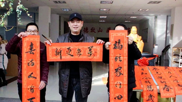 我校書法協(xié)會主席李尚民,書法協(xié)會會員劉勇、寇世珍、魏振中、陳玉柱、王威、李志超、李中合、張長林、祁志華、袁志正、劉宇昭等悉數(shù)到場,用濃墨“鴻國節(jié),恭辭舊歲”,以重彩“錦福春,賀迎新年”。他們現(xiàn)場揮毫潑墨,為師生書寫春聯(lián),展示書法的藝術(shù)魅力。