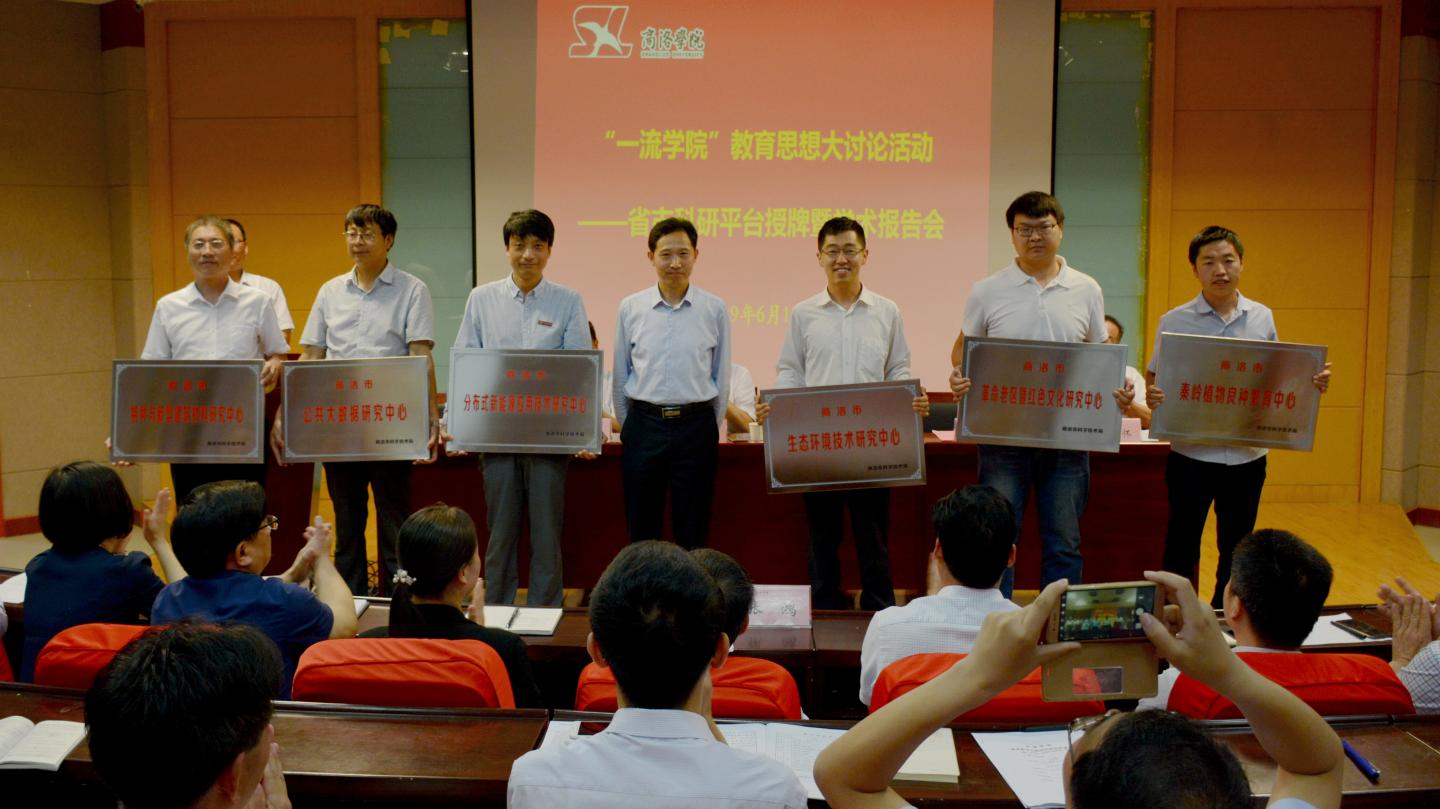 陜西省教育廳科技處處長甘世平為商洛文化暨賈平凹研究中心授牌;校黨委書記龍治剛為陜西秦嶺特色生物資源產(chǎn)業(yè)技術(shù)研究院授牌;校長范新會為秦嶺南麓生態(tài)環(huán)境保護研究創(chuàng)新團隊授牌;商洛市科技局局長趙緒春為商洛市生態(tài)環(huán)境技術(shù)研究中心等6個市級工程技術(shù)研究中心授牌。