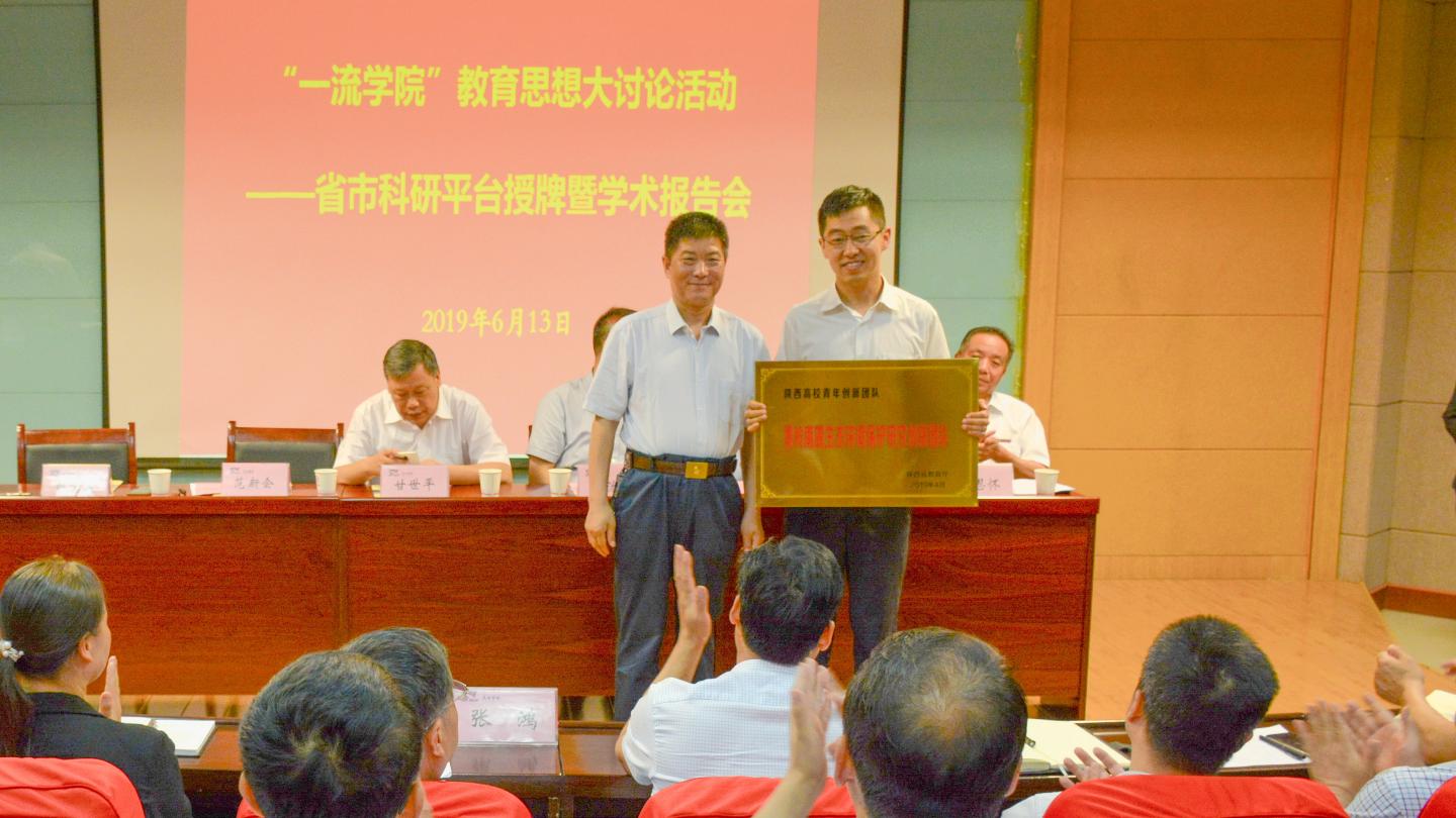 6月13日,我校舉行“一流學(xué)院”教育思想大討論活動——省市科研平臺授牌暨學(xué)術(shù)報告會。陜西省教育廳科技處處長甘世平、商洛市科技局局長趙緒春,我校黨委書記龍治剛、校長范新會、紀(jì)委書記王思懷、副校長劉寶盈出席授牌儀式。西安工業(yè)大學(xué)文學(xué)院院長馮希哲教授、西安郵電大學(xué)經(jīng)濟與管理學(xué)院院長張鴻教授,我校相關(guān)職能部門負責(zé)人及各院(部)院長、主任、科研副院長、科研秘書等教師代表參加了授牌儀式。授牌儀式由劉寶盈主持。