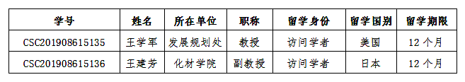 近日,國家留學基金委發(fā)布2019年西部地區(qū)人才培養(yǎng)特別項目(以下簡稱“西部項目”)錄取名單,我校發(fā)展規(guī)劃處王學軍教授,化材學院王建芳副教授獲得該項目的錄取資格,獲批公派出國留學一年。