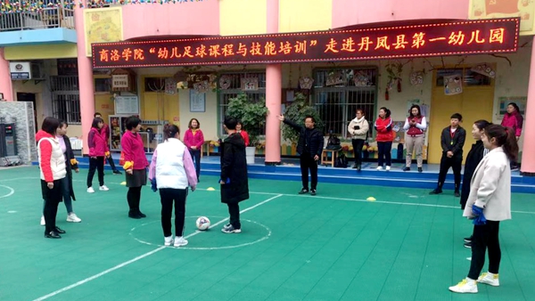 為進一步做好結對幫扶助力丹鳳脫貧攻堅工作,推進丹鳳縣幼兒足球示范園建設,我校與丹鳳縣科教體局于11月20日在丹鳳縣第一幼兒園共同舉辦了“幼兒足球課程與技能培訓”活動。我校“雙百工程”項目首席專家朱小強,體育教學研究部足球教師楊斌,丹鳳縣農(nóng)業(yè)農(nóng)村局、科教體局相關人員,丹鳳縣5所示范園和5所民辦幼兒園負責人及相關教師參加了此次活動。
