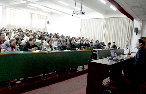 報告會上,曾大興對文學(xué)地理學(xué)這一新興學(xué)科進(jìn)行了詳細(xì)介紹,并運用文學(xué)地理學(xué)的理論和方法對《九月九日憶山東兄弟》《江雪》《漁家傲》《江城子(乙卯正月二十日夜記夢)》等多篇古典詩歌經(jīng)典作品進(jìn)行了解讀。曾教授優(yōu)雅的談吐,淵博的知識,風(fēng)趣的語言,獲得了現(xiàn)場師生熱烈的掌聲。