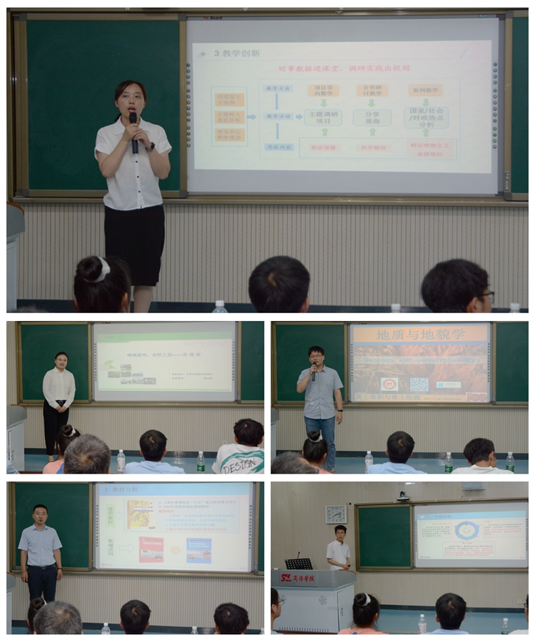 現(xiàn)場(chǎng)展示采取參賽教師5分鐘說(shuō)課和15分鐘講課的方式進(jìn)行。5名參賽教師精心備賽、準(zhǔn)備充分,以PPT課件、板書等傳統(tǒng)教學(xué)方式為基礎(chǔ),深入挖掘各自課程蘊(yùn)含的思政教育元素和所承載的思政教育功能,充分展示了各自的“課程思政”理論功底和教學(xué)風(fēng)采。