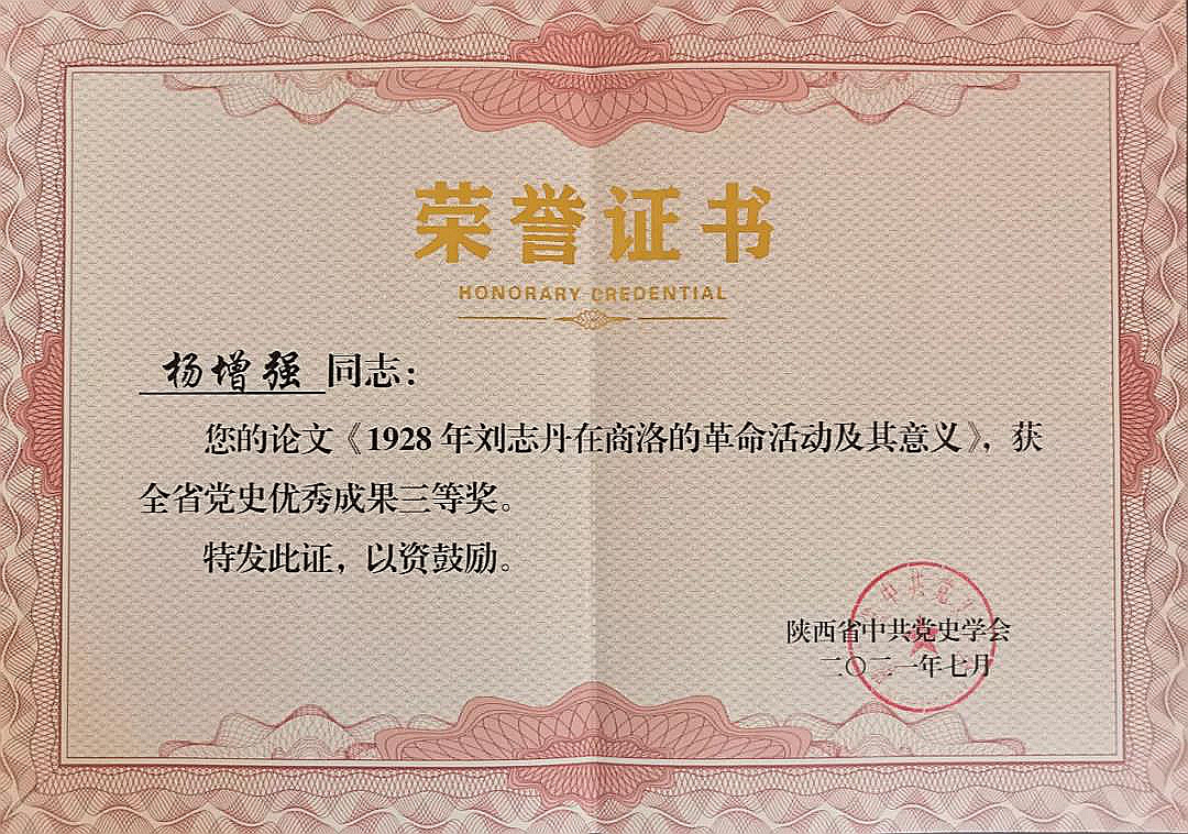 黨史學(xué)習(xí)教育開展以來(lái),陜西省中共黨史學(xué)會(huì)在全省范圍內(nèi)開展了研究成果評(píng)獎(jiǎng)活動(dòng)。我校楊增強(qiáng)教授的論文《1928年劉志丹在商洛的革命活動(dòng)及其意義》在評(píng)選活動(dòng)中獲得全省黨史優(yōu)秀成果三等獎(jiǎng)。