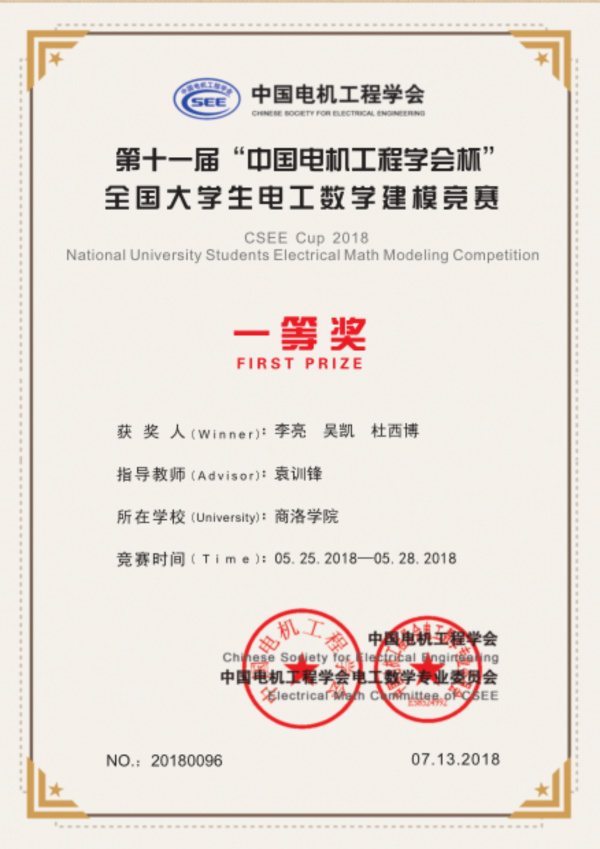 近日,中國電機(jī)工程學(xué)會(huì)電工數(shù)學(xué)專委會(huì)主辦的“第十一屆電工杯數(shù)學(xué)建模競(jìng)賽”和江蘇省工業(yè)與數(shù)學(xué)應(yīng)用學(xué)會(huì)主辦的“第十五屆五一數(shù)學(xué)建模競(jìng)賽”比賽結(jié)果揭曉,由我校學(xué)生李亮、吳凱、杜西博組成的參賽隊(duì)伍獲得第十一屆“電工杯”數(shù)學(xué)建模競(jìng)賽一等獎(jiǎng),這是我校學(xué)生首次獲得電工杯數(shù)學(xué)建模競(jìng)賽全國一等獎(jiǎng)。此外,我校參賽學(xué)生還在這兩個(gè)比賽中獲得國家級(jí)二等獎(jiǎng)2項(xiàng)、三等獎(jiǎng)6項(xiàng),省級(jí)二等獎(jiǎng)2項(xiàng)、三等獎(jiǎng)6項(xiàng)的好成績(jī)。