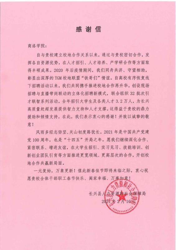 春節(jié)前夕,浙江省湖州市長興縣向我校發(fā)來感謝信,高度肯定我校為當(dāng)?shù)厝瞬耪幸透哔|(zhì)量趕超發(fā)展做出的積極貢獻(xiàn),重申了與我校在抗擊疫情、復(fù)工復(fù)產(chǎn)中凝結(jié)的同舟共濟、守望相助的友好關(guān)系。希望與我校進(jìn)一步擴展合作領(lǐng)域,提升合作層次,開創(chuàng)校地合作共贏新局面。