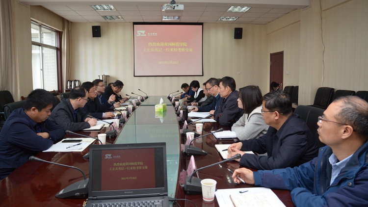 3月26日,黃岡師范學院黨委書記王立兵一行來??疾旖涣?,校黨委書記龍治剛、黨委副書記劉勇陪同考察并出席座談會。
