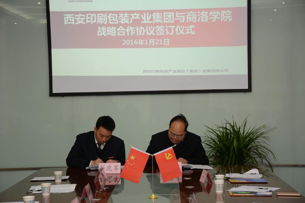 2016年1月21日,我校與西安印刷包裝產(chǎn)業(yè)集團(tuán)在西安經(jīng)濟(jì)技術(shù)開發(fā)區(qū)草灘生態(tài)產(chǎn)業(yè)園簽署戰(zhàn)略合作協(xié)議并舉行授牌儀式。校黨委副書記彭虎軍與西安印刷包裝產(chǎn)業(yè)集團(tuán)董事長(zhǎng)袁學(xué)武代表校企雙方在協(xié)議上簽字。彭虎軍在簽約儀式之后向西安印刷包裝產(chǎn)業(yè)集團(tuán)授予“商洛學(xué)院大學(xué)生創(chuàng)新創(chuàng)業(yè)實(shí)踐基地”和“商洛學(xué)院教學(xué)實(shí)踐基地”牌。學(xué)校黨政辦公室、教務(wù)處、學(xué)生處、招生就業(yè)處等部門領(lǐng)導(dǎo),西安印刷包裝產(chǎn)業(yè)集團(tuán)黨總支副書記劉海軍及集團(tuán)有關(guān)部門人員參加了簽約授牌儀式。簽約授牌儀式由劉海軍主持。