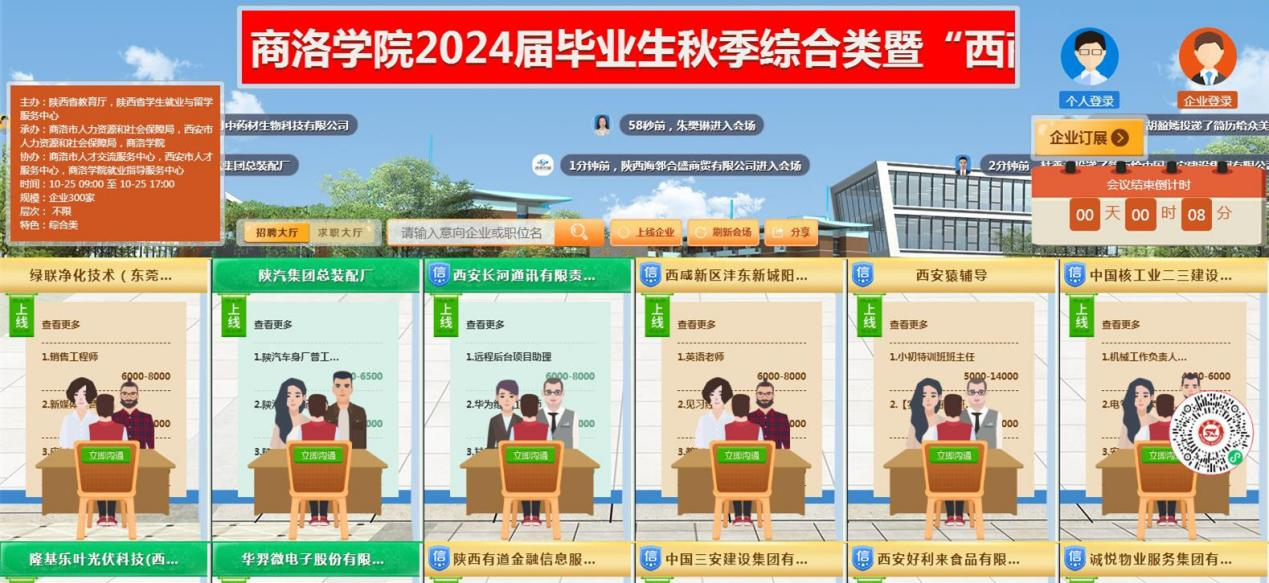 為切實(shí)做好我校2024屆畢業(yè)生就業(yè)工作,促進(jìn)畢業(yè)生更加充分、更高質(zhì)量就業(yè),10月25日,由陜西省教育廳,陜西省學(xué)生就業(yè)與留學(xué)服務(wù)中心指導(dǎo),西安市人社局、商洛市人社局和我校聯(lián)合主辦,商洛市人才中心、西安市人才中心和我校就業(yè)中心承辦的2024屆畢業(yè)生秋季綜合類暨“西商融合發(fā)展”專場(chǎng)網(wǎng)絡(luò)視頻招聘會(huì)依托貓頭英云人才市場(chǎng)順利舉辦。