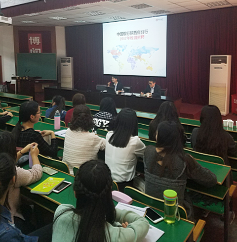 中國銀行商洛分行人力資源部負責人從企業(yè)概況、員工職業(yè)生涯規(guī)劃和2017年校園招聘安排等方面作了詳細講解,鼓勵有意向畢業(yè)生積極參加招聘,將來在工作崗位發(fā)揮專業(yè)特長,實現(xiàn)人生價值。