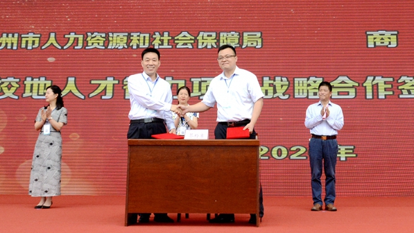 彭虎軍與郭連偉代表雙方簽署校地人才智力項目戰(zhàn)略合作協(xié)議,代表我校接受“人才工作站”授牌。