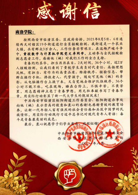 近日,中共西安市臨潼區(qū)櫟陽街道工作委員會(huì)、街道辦事處向我校發(fā)來感謝信。信中熱情贊揚(yáng)了我校學(xué)生黨文卓在櫟陽街道全民核酸檢測(cè)志愿服務(wù)工作中所作出的貢獻(xiàn),同時(shí)對(duì)我校教育培養(yǎng)優(yōu)秀學(xué)生表示誠(chéng)摯感謝。