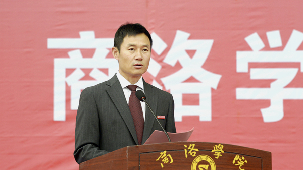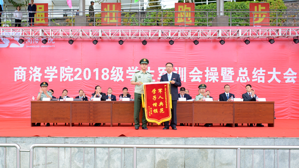 大會在莊嚴(yán)雄壯的國歌聲中拉開帷幕。校黨委書記龍治剛對全體承訓(xùn)教官不畏風(fēng)雨、認(rèn)真負(fù)責(zé)、辛勤努力的付出表示感謝,并代表學(xué)校向中國人民武警部隊商洛支隊贈送了寫有“軍人典范 學(xué)子楷?!钡腻\旗。