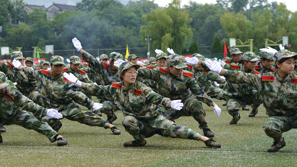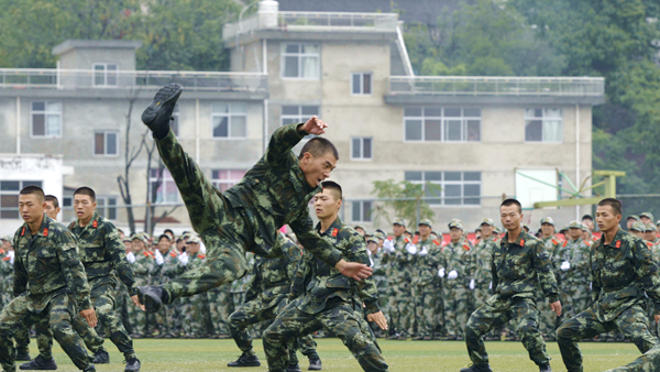 分列式結(jié)束后,軍訓(xùn)教官和學(xué)生進(jìn)行了格斗、匕首操、五步拳匯報表演。教官們精彩的格斗表演氣勢威猛如虎、出手灑脫有力,盡展果敢剛強(qiáng)的軍人本色,讓人熱血沸騰;女兵們表演的匕首操動作整齊、聲音洪亮,完美詮釋了“巾幗不讓須眉”的豪情壯志;全體參訓(xùn)學(xué)生共同完成的五步拳表演扎實(shí)穩(wěn)健、氣勢磅礴,展現(xiàn)了我校學(xué)子昂揚(yáng)的青春斗志,引起了現(xiàn)場師生陣陣歡呼與掌聲。