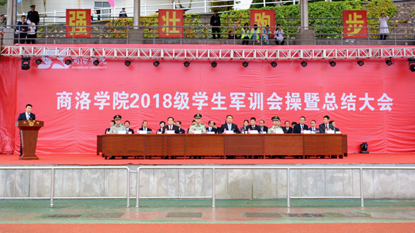 汗水書寫青春,磨練見證成長。9月20日,我校隆重舉行2018級學(xué)生軍訓(xùn)會操暨總結(jié)大會,檢閱2018級學(xué)生軍訓(xùn)成果,并對軍訓(xùn)中表現(xiàn)突出的先進(jìn)集體與先進(jìn)個人進(jìn)行表彰。校領(lǐng)導(dǎo)龍治剛、范新會、魏書堂、劉寶盈、劉勇,中國人民武警部隊商洛支隊副參謀長、軍訓(xùn)團(tuán)團(tuán)長呂喆少校,中國人民武警部隊商洛支隊執(zhí)勤一大隊隊長郭偉少校出席大會。各二級學(xué)院黨政主要負(fù)責(zé)人、有關(guān)職能部門負(fù)責(zé)人、全體2018級學(xué)生及輔導(dǎo)員參加了大會。大會由黨委副書記彭虎軍主持。