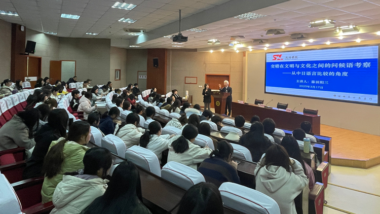 报告?x)上Q藤田阳三教授以《交错在文明与文化之间的问候语考察——从中日语言比较的角度》ؓ(f)题,通过列D实例Q详l对比了(jin)中日问候语在表达方式、用场景和蕴含寓意上的异同。他认ؓ(f)Q国家和地区的文明和文化都融合在语言之中Q问候语作ؓ(f)人际沟通交的开始,能清晰映照出中日两国在社?x)结构、h(hun)D念上的区别,h重要意义Q青q学子要感受、体验不同的文化力Qؓ(f)中日两国的友好交作?gu)A(ch)献。陕西师范大学外国语学院日语教师王红作报告会(x)现场译?nbsp;