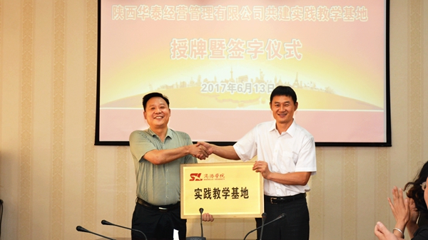 6月13日,我校與陜西華泰經(jīng)營管理有限公司共建實踐教學(xué)基地授牌暨簽字儀式在學(xué)校四樓會議室舉行。副校長劉勇向陜西華泰經(jīng)營管理有限公司董事長李仁斌授牌。教務(wù)處處長李超與陜西華泰經(jīng)營管理有限公司總經(jīng)理閆博簽訂合作協(xié)議。儀式由經(jīng)管學(xué)院副院長王怡主持。經(jīng)管學(xué)院、建工學(xué)院教師代表參加活動。