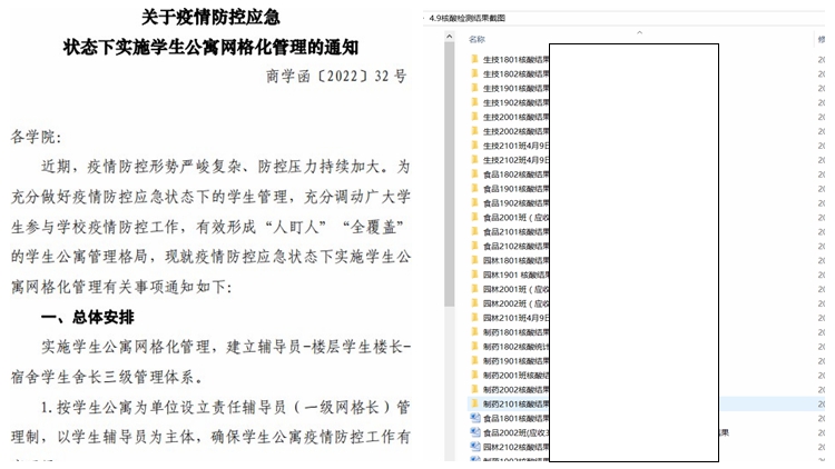 ——嚴(yán)密部署,科學(xué)管控。4月7日當(dāng)天,學(xué)院迅速響應(yīng)疫情防控摸排通知要求,框定時間地點,對57名教職工以及952名學(xué)生進(jìn)行細(xì)致排查,沒有一名師生與陽性病例有過時空交集。學(xué)院疫情防控專班學(xué)生工作組、信息統(tǒng)計組隨即列出清單,第一時間統(tǒng)計出全院師生所在地及近期行程安排,掌握師生的當(dāng)前狀態(tài),安排專人每日定時報送師生各項數(shù)據(jù),做到“人數(shù)清、狀態(tài)明”。在6次全員核酸檢測中,學(xué)院分布在兩校區(qū)的師生按照“采樣前逐人簽到”“采樣后收繳報告”的雙向聯(lián)動并行方式,切實做到應(yīng)檢盡檢、不漏一人。