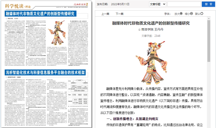 5月份以來,我校教師袁訓鋒、田祎、王丹丹先后在《陜西科技報》理論版刊發(fā)《垃圾分類促進秦嶺生態(tài)保護與提升公民科學素質實踐研究》《商洛市科普信息化建設研究》《融媒體時代非物質文化遺產(chǎn)的創(chuàng)新型傳播研究》三篇文章,圍繞秦嶺生態(tài)保護、科普信息化建設、非物質遺產(chǎn)創(chuàng)新傳播等主題,介紹我校科研服務地方實踐成果和經(jīng)驗。文章主要內容如下: