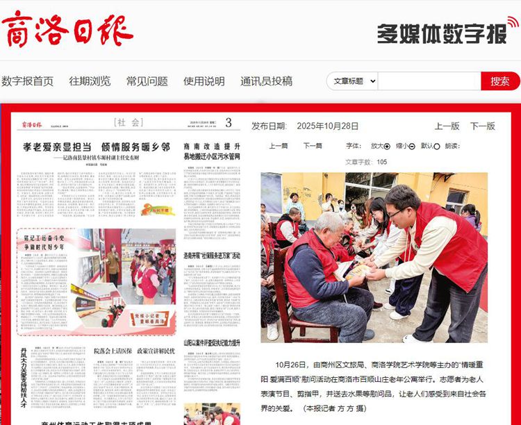 10月26日,由商州區(qū)文旅局、商洛學(xué)院藝術(shù)學(xué)院等主辦的“情暖重陽 愛滿百順”慰問活動(dòng)在商洛市百順山莊老年公寓舉行。志愿者為老人表演節(jié)目、剪指甲,并送去水果等慰問品,讓老人們感受到來自社會(huì)各界的關(guān)愛。 (本報(bào)記者 方 方 攝)