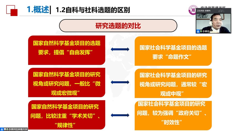 為切實(shí)做好2022年國家社會(huì)科學(xué)基金、自然科學(xué)基金項(xiàng)目申報(bào)工作,有效提升教師申請(qǐng)國家級(jí)科研項(xiàng)目的意識(shí),提高教師高層次課題申報(bào)能力及申請(qǐng)書撰寫的質(zhì)量,1月5日,經(jīng)濟(jì)管理學(xué)院以騰訊會(huì)議的方式舉辦2022年國家社科基金、自然科學(xué)基金項(xiàng)目申報(bào)經(jīng)驗(yàn)分享交流會(huì),邀請(qǐng)國家自然科學(xué)基金委同行評(píng)審專家、西安理工大學(xué)博士生導(dǎo)師李秉祥教授作經(jīng)驗(yàn)交流分享。會(huì)議由學(xué)院副院長周小婷主持。學(xué)院全體教師參加會(huì)議。