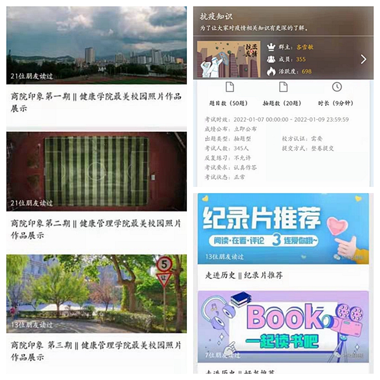 為切實(shí)做好疫情封校期間學(xué)生防疫知識(shí)普及、心理疏導(dǎo)等工作,進(jìn)一步加強(qiáng)對(duì)學(xué)生的人文關(guān)懷,健康管理學(xué)院團(tuán)總支堅(jiān)持以學(xué)生為主體,以育人為中心,以活動(dòng)為載體,堅(jiān)持貼近實(shí)際、貼近生活、貼近學(xué)生原則,借助學(xué)院微信公眾號(hào)、易班平臺(tái)等載體,開(kāi)展了一系列內(nèi)容鮮活、形式新穎、吸引力強(qiáng)的活動(dòng),活動(dòng)效果良好。