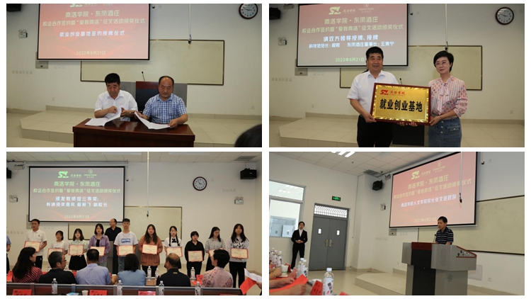 人文學(xué)院黨委書記杜明生與王青寧共同簽署了《校企合作共建大學(xué)生創(chuàng)新創(chuàng)業(yè)實踐基地協(xié)議》。程敏代表學(xué)校向陜西東鳳酒莊有限公司“大學(xué)生創(chuàng)新創(chuàng)業(yè)實踐基地”授牌,王青寧代表企業(yè)接牌并作表態(tài)發(fā)言。魚在洋由衷贊美了商洛的悠久的人文傳統(tǒng)和獨(dú)特的葡萄酒文化,充分肯定了此次征文活動的意義。南書堂深情回顧了自己在母校商洛學(xué)院讀書求學(xué)的經(jīng)歷,對校企雙方在培養(yǎng)優(yōu)秀人才、服務(wù)商洛社會、弘揚(yáng)地方優(yōu)秀文化過程中取得的成績表示熱烈祝賀,并期待商洛學(xué)院和東鳳酒莊的深入合作能夠再次譜寫地方特色產(chǎn)業(yè)發(fā)展和文化品牌建設(shè)的歷史新篇章。