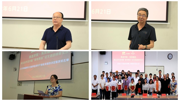 6月21日,人文學(xué)院與陜西東鳳酒莊有限公司共同舉辦校企合作簽約儀式暨“愛我商洛”征文活動頒獎活動。《商洛日報社》總編輯南書堂、商洛市作協(xié)主席魚在洋、丹鳳縣政府教育督導(dǎo)室主任白寬虎、丹鳳縣科技統(tǒng)籌中心主任李書軍、丹鳳縣委黨校副校長程毅飛、商洛學(xué)院科技處處長程敏、商洛學(xué)院教務(wù)處副處長李會榮、陜西東鳳酒莊有限公司總經(jīng)理王青寧、商洛學(xué)院人文學(xué)院全體黨政領(lǐng)導(dǎo)出席。征文活動獲獎?wù)吆蜕搪鍖W(xué)院人文學(xué)院師生代表共一百余人參加了活動?;顒佑扇宋膶W(xué)院副院長馬英群主持。