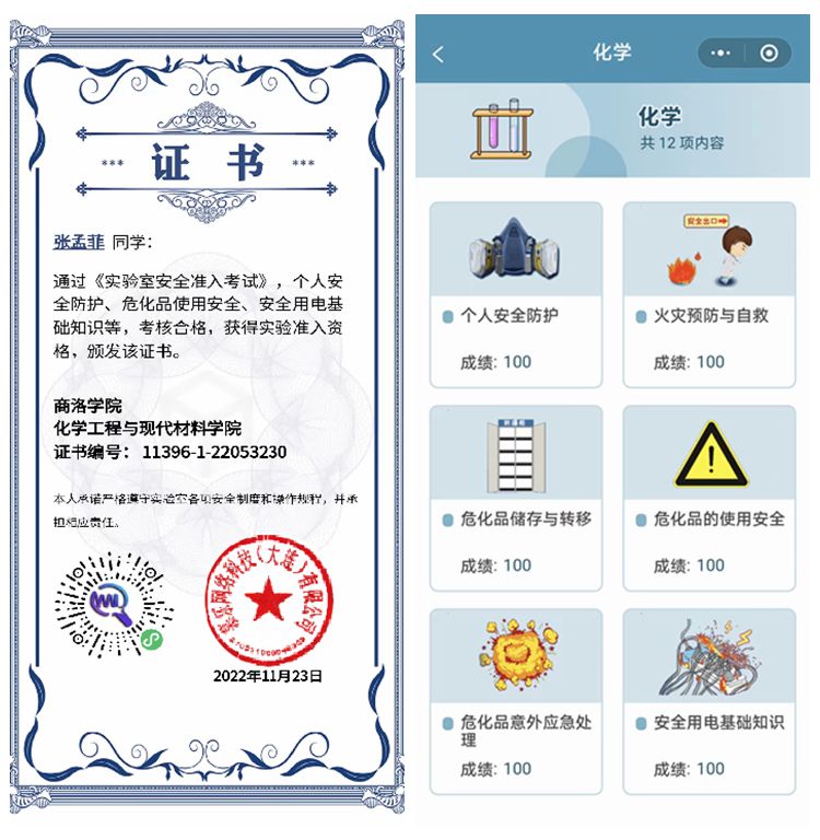 活動內(nèi)容主要為慕樂網(wǎng)絡(luò)開發(fā)的虛擬實(shí)驗(yàn)室安全知識考核,包括個人安全防護(hù)、火災(zāi)預(yù)防與自救、高溫低溫操作安全、玻璃器材使用安全、?;穬Υ媾c轉(zhuǎn)移、?;返氖褂冒踩馄渴褂冒踩?、廢棄物的安全處理與管控、?;芬馔鈶?yīng)急處理、安全用電基礎(chǔ)知識、高壓釜使用安全、化工原理等實(shí)驗(yàn)室相關(guān)安全知識。學(xué)生以趣味通關(guān)的方式完成考核,闖關(guān)成功后即獲得實(shí)驗(yàn)室安全考核合格證書。