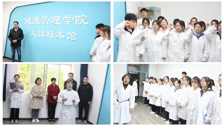 護理系系主任贠航從多方面對學院人體標本館作了介紹,實驗室中心主任陳穎宣讀了《人體標本館進館須知》,護理系教師王濤帶領與會師生詳細參觀了人體標本館,學生代表胡虔熙帶領全體學生重溫了醫(yī)學生誓言。