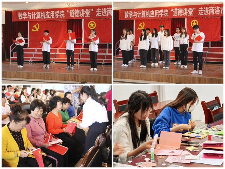 本次道德講堂由唱一首歌曲、講一個故事、誦一段經(jīng)典、作一個承諾、送一份吉祥五個環(huán)節(jié)組成?;顒釉跀?shù)計學院學子帶來的團體操表演《盛夏光年·心國旋律》中拉開了帷幕,郝雅馨、肖茹丹等10位同學合唱并表演了手語操《感恩的心》,號召大家常懷感恩之心;楊夏懿同學講述了丹鳳縣龍駒初級中學彭莉老師尊老愛老的美德故事,全體學生進行了《尊老愛老》承諾宣誓,并向在場的爺爺奶奶們送上了親手制作的精美賀卡。老年大學的爺爺奶奶們也為青年學子帶來了《久別的草原》《十送紅軍》等經(jīng)典曲目,將活動氣氛推向高潮?;顒幼詈笤谌珗鲇^眾齊唱《我和我的祖國》中落下帷幕。